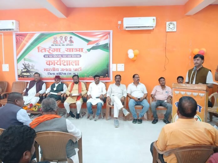 हिंद स्वराष्ट्र कोरिया राजन पाण्डेय : देश व्यापी तिरंगा यात्रा को संदर्भ में भाजपा जिला कार्यालय छिंदडांड़ बैकुण्ठपुर में जिला कार्यशाला में हर घर तिरंगा यात्रा को सफल बनाने की रणनीति तय की गई। बैठक में मुख्य रूप मे प्रभारी रामकिसुन सिंह, विधायक भईयालाल राजवाड़े, जिलाध्यक्ष देवेन्द्र तिवारी, संयोजक कृष्णबिहारी जायसवाल, पूर्व जिला उपाध्यक्ष शैलेष शिवहरे, जिला उपाध्यक्ष अशोक जायसवाल, बसंत राय, राजेश सिंह, अनिल साहू, रविशंकर राजवाड़े, चुन्नी पैकरा, जिला महामंत्री पंकज गुप्ता, कपिल जायसवाल, जिला पंचायत अध्यक्ष मोहित पैकरा, जिला पंचायत उपाध्यक्ष वंदना राजवाड़े, जनपद अध्यक्ष आशादेवी सोनपाकर, नपाध्यक्ष अरूण जायसवाल, जिला मंत्री शिव कुमारी सोनपाकर, ईश्वर राजवाड़े, शारदा गुप्ता, जिला कोषाध्यक्ष रामकृष्ण शर्मा उपस्थित रहें।
