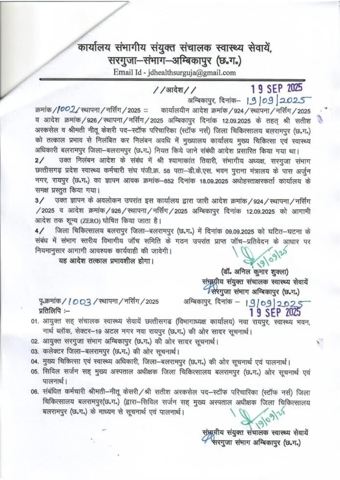 हिंद स्वराष्ट्र अम्बिकापुर : 3 माह की बच्ची को बिना ऑक्सीजन सपोर्ट के रेफर मामले में निलंबित दोनों स्वास्थ्यकर्मियों के निलंबन आदेश को निरस्त कर दिया गया हैं।जांच में लापरवाही की पुष्टि के बाद दोनों स्वास्थ्य कर्मियों को निलंबित किया गया था, लेकिन संयुक्त संचालक स्वास्थ्य द्वारा अपने आदेश को वापस लेते हुए निलंबन आदेश को शून्य घोषित कर दिया है। जहां एक और इस मामले में निलंबन आदेश जारी कर और लापरवाही बर्दाश्त नहीं किए जाने की बात कहकर जेडी द्वारा खूब वाहवाही लूटी गई थी वहीं दूसरी और निलंबन आदेश को वापस लेकर वे अब अपनी काफी किरकिरी करवा रहे हैं।