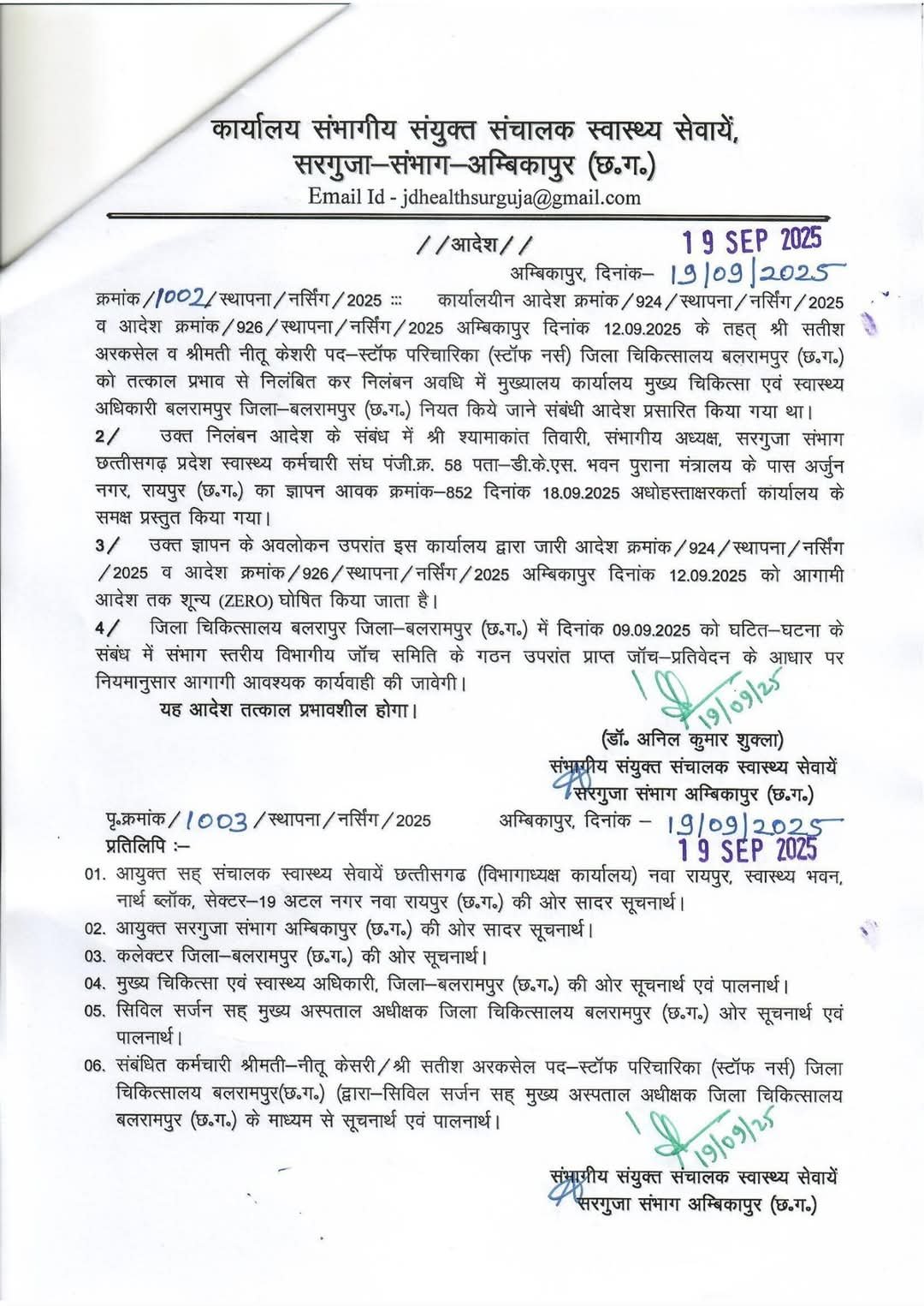 स्वास्थ विभाग द्वारा निलंबन आदेश को जारी करने के बाद स्वास्थ्य कर्मचारी संघ द्वारा पत्र लिखकर निलंबन निरस्त कर प्रकरण की जांच संभाग स्तरीय जांच टीम से कराने की मांग जेडी डॉ अनिल शुक्ला से की गई थी जिसके बाद संयुक्त संचालक डॉ. अनिल शुक्ला द्वारा निलंबन आदेश जारी करने के ठीक एक हफ्ते बाद 19 सितंबर को एक आदेश जारी कर पूर्व में जारी निलंबन आदेश को शून्य घोषित कर दिया साथ ही इस मामले की जांच संभाग स्तरीय टीम से कराने की बात लिख दी।