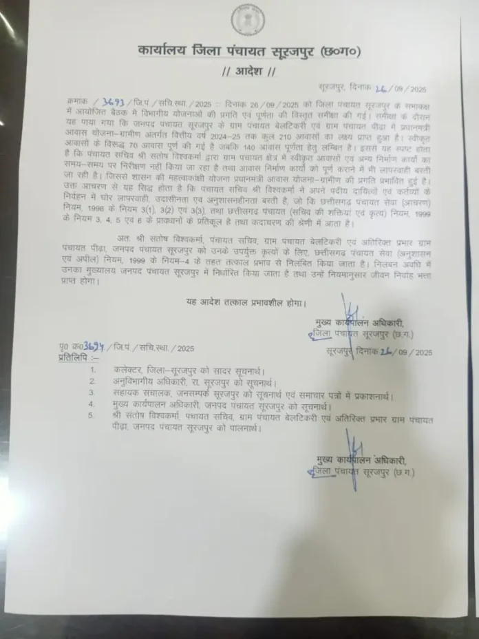 अतः सतोष विश्वकर्मा, पंचायत सचिव, ग्राम पंचायत बेलटिकरी एवं अतिरिक्त प्रभार ग्रान पंचायत पीढा, जनपद पंचायत सूरजपुर को उनके उपर्युक्त कृत्यों के लिए, छत्तीसगढ़ पंचायत सेवा (अनुशासन एवं अपील) नियम, 1999 के नियम-4 के तहत तत्काल प्रभाव से निलंबित किया जाता है। निलंबन अवधि में उनका मुख्यालय जनपद पंचायत सूरजपुर में निर्धारित किया जाता है तथा उन्हें नियमानुसार जीवन निर्वाह भत्ता प्राप्त होगा।