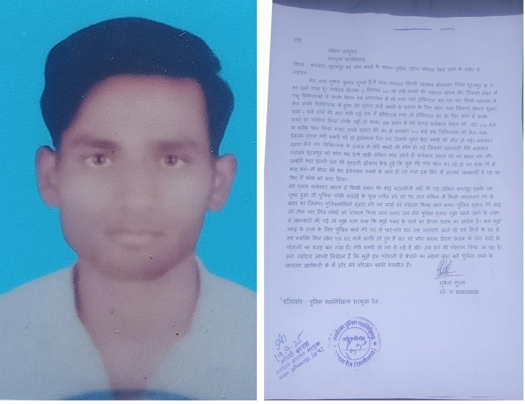 दरअसल भैयाथान विकासखंड के ग्राम सिरसी के मुकेश गुप्ता जो कि हिंद स्वराष्ट्र समाचारपत्र के ब्लॉक प्रतिनिधि हैं और एक पशु पालक भी हैं। उनकी एक बकरी बीमार थी जिसके इलाज के लिए मुकेश पशु विभाग अस्पताल पहुंचे थे जहां पशु विभाग के डॉक्टर अस्पताल में ताला लगाकर अस्पताल से नदारत थे। जिसके बाद उनके द्वारा किसी तरह से दूरभाष के माध्यम से डॉक्टर से संपर्क किया गया इस पर डॉक्टर द्वारा उन्हें शाम 4 से 5 के बीच में आने स्वयं या फिर मुकेश गुप्ता को अपने पशु को लेकर अस्पताल आने की बात कही गई लेकिन पशु चिकित्सक द्वारा लापरवाही करते हुए बकरी के इलाज के लिए कोई कदम नहीं उठाए गए जिस पर मुकेश गुप्ता द्वारा डॉक्टर से संपर्क करने के कई प्रयास किए गए लेकिन उनके द्वारा फोन नहीं उठाया गया। चुकी एक पशुपालक के लिए किसी पशु की जान की कीमत बहुत अधिक होती है इसलिए उनके द्वारा इस संबंध में सूरजपुर कलेक्टर से बात की गई सूरजपुर कलेक्टर द्वारा रात के 11:30 बजे पशु विभाग से किसी कर्मचारी को भेजा गया लेकिन कर्मचारी द्वारा बकरी को इंजेक्शन लगाते ही बकरी की मौत हो गई। इस संबंध में जानकारी देने के लिए मुकेश गुप्ता द्वारा कलेक्टर सूरजपुर को कॉल किया गया जिस पर कलेक्टर भड़क गए और उनके द्वारा कहां गया कि ” बकरी मर गई तो मैं क्या करूं और तुम होते कौन हो तुम्हारी औकात कैसे हुई मुझे इतनी रात को कॉल करने की..??” जिस पर मुकेश गुप्ता द्वारा एक आम नागरिक होने की बात कही गई और फोन रख दिया। लेकिन मुकेश गुप्ता द्वारा रात्रि 12:00 बजे कलेक्टर को फोन करना कलेक्टर सूरजपुर को नागवार गुजरा और उनके द्वारा पुलिस को मुकेश गुप्ता को उठाने के आदेश दे दिए गए इसके बाद बसदई पुलिस द्वारा मुकेश गुप्ता के घर लगातार छापेमारी की गई और उनके अनुपस्थिति में मुकेश गुप्ता की पत्नी से अभद्रता की गई। इसी बीच पुलिस के लगातार छापेमारी के कारण गुप्ता द्वारा अंबिकापुर पहुंचकर संभाग आयुक्त नरेंद्र दुग्गा और पुलिस महानिरीक्षक दीपक झा से इस मामले की शिकायत की गई और मामले से उन्हें बचाने की मांग की गई, लेकिन डीएम के आदेश के आगे बसदई पुलिस कहां पीछे हटने वाली थी उनके द्वारा आज दिनांक 27 सितंबर 2025 को पत्रकार मुकेश गुप्ता को उनके घर से उठा लिया गया है।