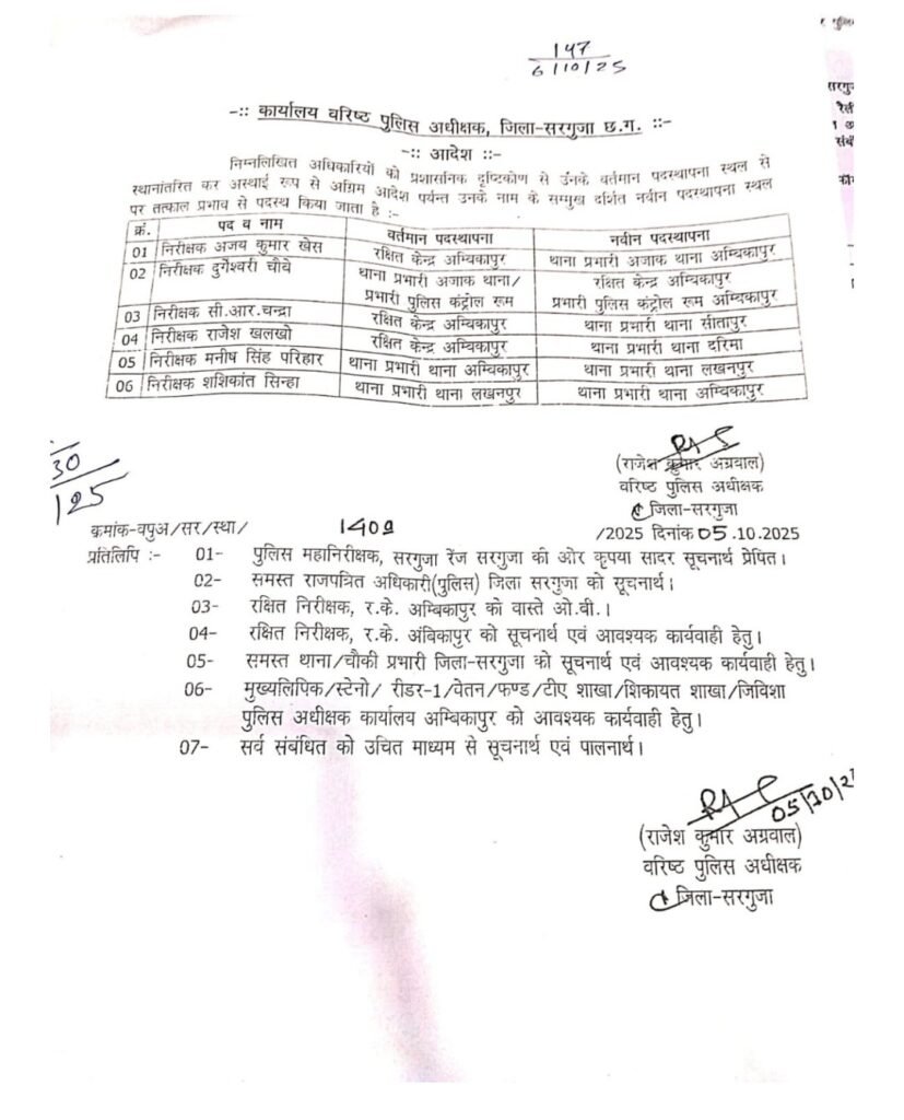 सरगुजा पुलिस विभाग में तबादले, 6 निरीक्षकों के प्रभार में हुए परिवर्तन, देखें आदेश…