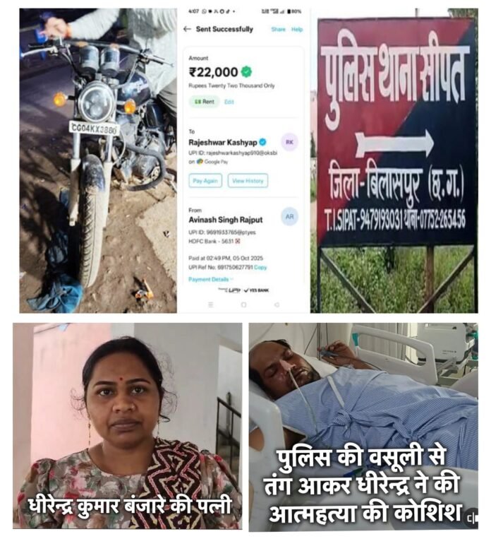 बिलासपुर (विशेष संवाददाता ): छत्तीसगढ़ के बिलासपुर ज़िले की सीपत थाना पुलिस पर अवैध वसूली के गंभीर आरोप लगे हैं। आरोप है कि थाना पुलिस ने एक एनटीपीसी कर्मचारी और एक व्यापारी से उनकी गाड़ी पकड़कर और कार्रवाई का डर दिखाकर अवैध वसूली की। पुलिस के लगातार दबाव और धमकी से परेशान होकर, एनटीपीसी कर्मचारी ने आत्महत्या का प्रयास किया और ज़हर खा लिया।