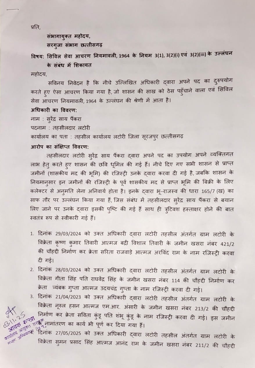 भ्रष्टाचार की देवी की संरक्षण में फल फूल रहे थे तहसीलदार देखने का विषय होगा अब की क्या सरगुजा कमिश्नर से शिकायत के बाद इन पर हो सकेगी कोई कार्रवाई..? या मुख्यमंत्री के करीबी होने का ट्रंप कार्ड उन्हें इस जांच/कार्यवाही से भी रखेगा मुक्त..??