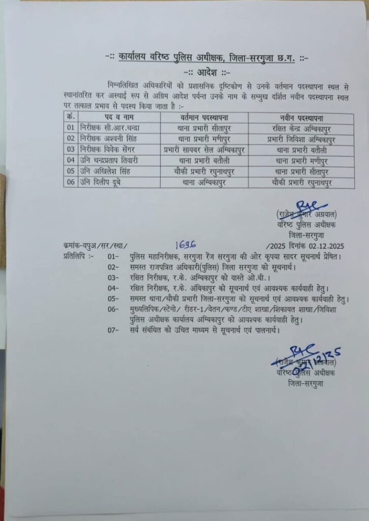 हिंद स्वराष्ट्र अम्बिकापुर : सीतापुर में हुए बवाल के बाद सीतापुर थाना प्रभारी निरीक्षक सी. आर. चंद्रा को रक्षित केंद्र भेज दिया गया है, वही उप निरीक्षक अखिलेश सिंह को सीतापुर थाने का प्रभार सौंपा गया है। इसके साथ ही एसएसपी सरगुजा द्वारा दो अन्य पुलिस निरीक्षकों के तबादले किए गए हैं जिसमें अश्वनी सिंह को प्रभारी जिविशा अंबिकापुर और निरीक्षक विवेक सेंगर को थाना प्रभारी बतौली बनाया गया है। वहीं उप निरीक्षक सी.पी.तिवारी को थाना प्रभारी मणिपुर तो उप निरीक्षक दिलीप दुबे को चौकी प्रभारी रघुनाथपुर बनाया गया है।