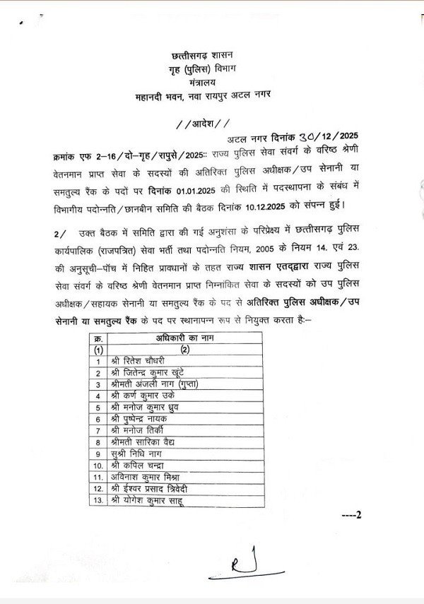 हिंद स्वराष्ट्र अम्बिकापुर : छत्तीसगढ़ शासन गृह पुलिस विभाग मंत्रालय द्वारा 16 डीएसपी रैंक के अधिकारियों को अतिरिक्त पुलिस अधीक्षक/अप सेनानी या समतुल्य रैंक के पद पर पदोन्नति दी है।
