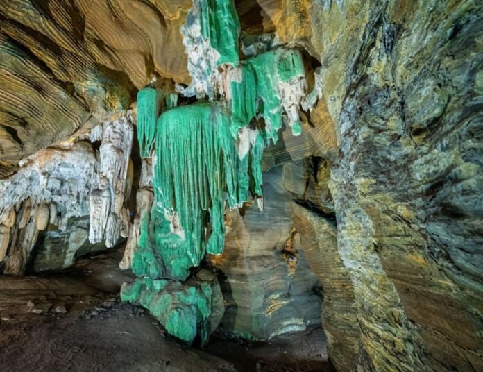 खनिज संरचना: विशेषज्ञों का मानना है कि गुफा की चट्टानों में तांबे (Copper) या अन्य खनिजों की मौजूदगी हो सकती है, जो ऑक्सीकरण के कारण हरा रंग छोड़ते हैं।