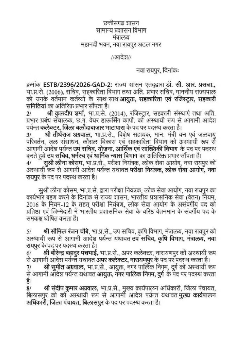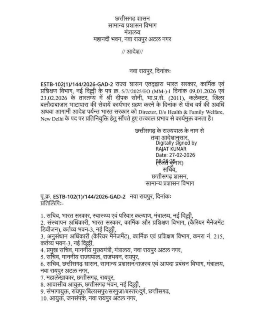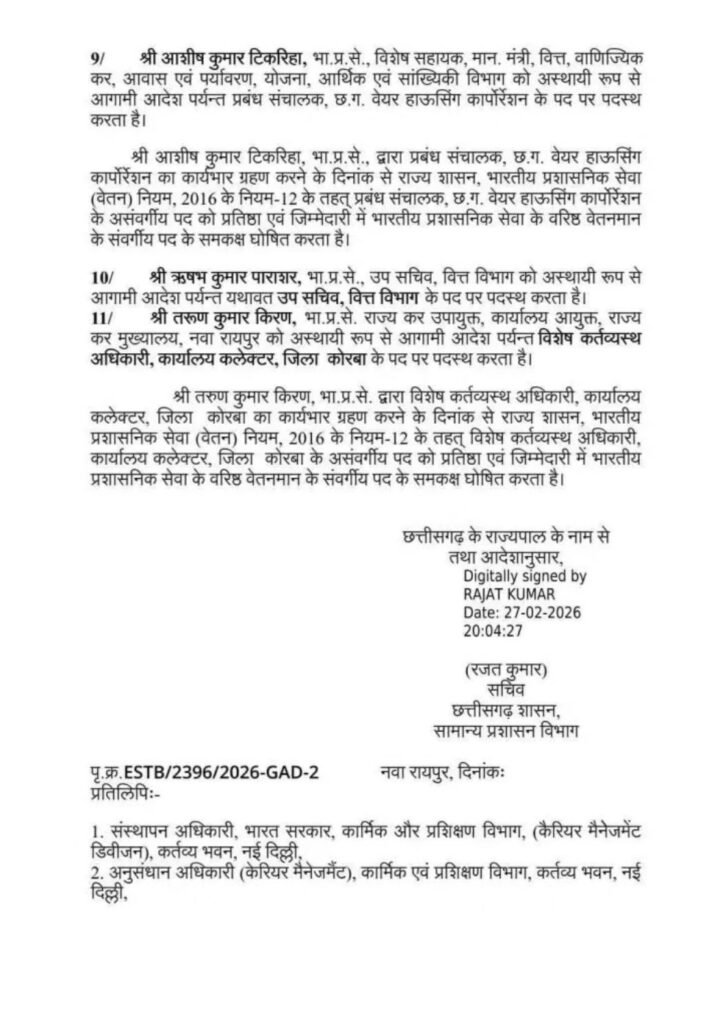 राजकीयछत्तीसगढ़ 11 आईएएस अधिकारियों के तबादले, देखें आदेश… By Mrinmayee Pandey - February 27, 2026 0 Share FacebookTwitterWhatsAppTelegram हिंद स्वराष्ट्र रायपुर : राज्य शासन द्वारा आज 11 IAS अधिकारियों के तबादले किए गए हैं। देखें आदेश : Share this: Share on Facebook (Opens in new window) Facebook Share on WhatsApp (Opens in new window) WhatsApp Share on X (Opens in new window) X Email a link to a friend (Opens in new window) Email Share on Telegram (Opens in new window) Telegram
