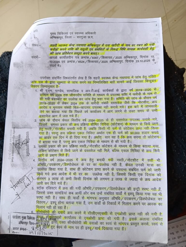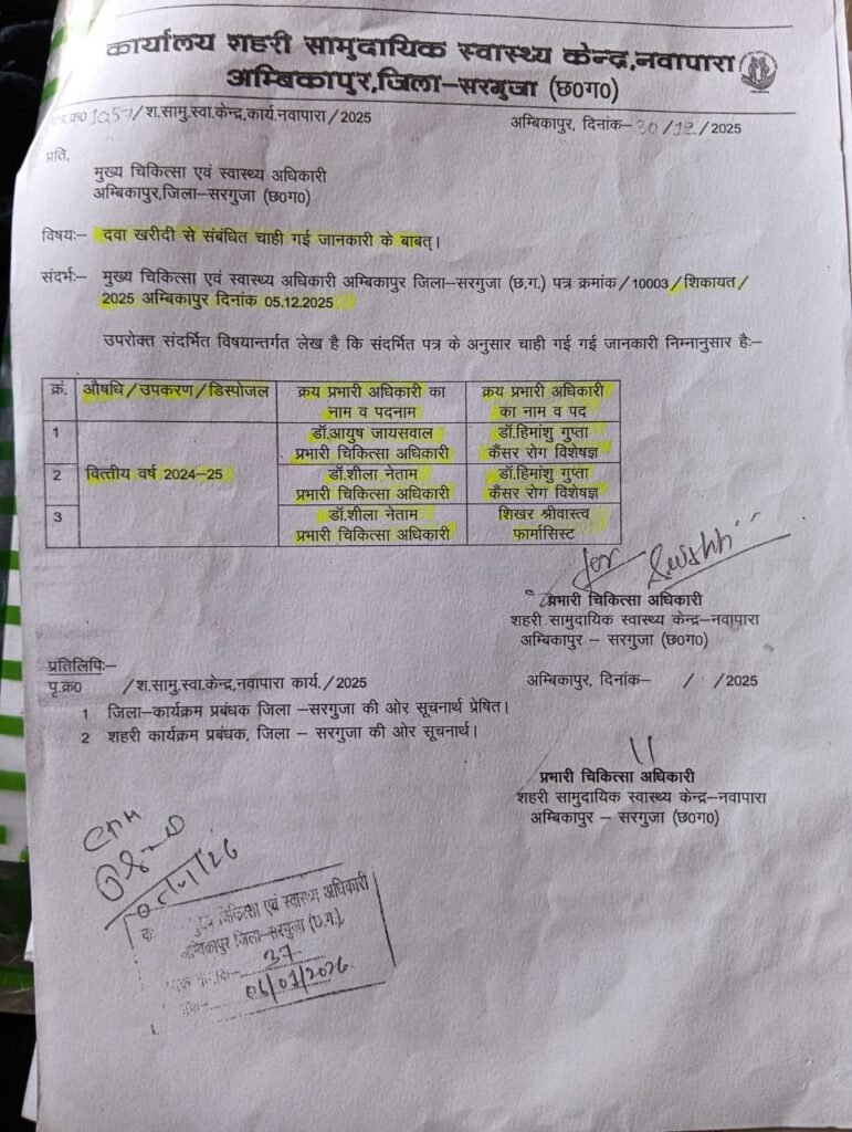 हिंद स्वराष्ट्र अंबिकापुर : सरगुजा जिले के नवापारा शहरी सामुदायिक स्वास्थ्य केंद्र में हुए करोड़ों के दवा घोटाले में एक नया मोड़ आ गया है। जांच समिति द्वारा भ्रष्टाचार के पुख्ता सबूत पेश किए जाने के महीनों बाद भी अब तक दोषियों पर कोई कार्रवाई नहीं होना, जिला प्रशासन की कार्यप्रणाली पर गंभीर सवाल खड़े कर रहा है।